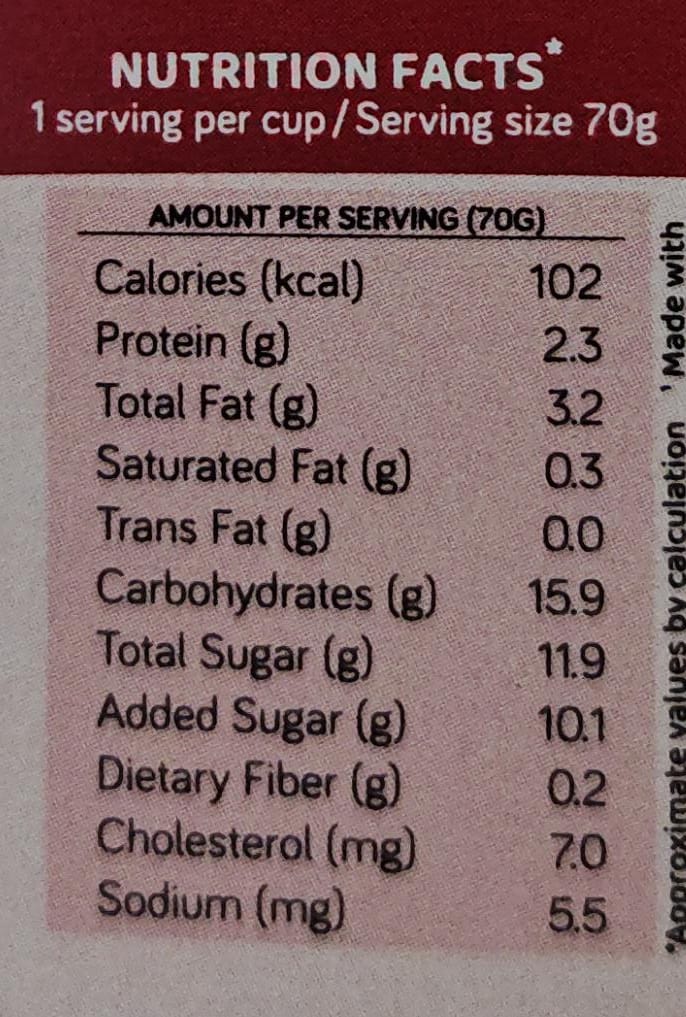 102 calories per serving, 95% fat free, Made With Khand (Muscovado sugar)