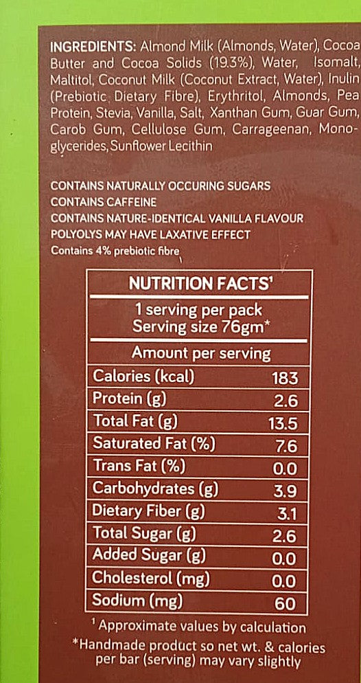 INGREDIENTS: Almond Milk (Almonds, Water), Cocoa Butter, Cocoa Solids (19.3%), Water, Isomalt, Maltitol, Coconut Milk (Coconut Extract, Water), Inulin, (Prebiotic Dietary Fibre), Erythritol, Almonds, Pea Protein, Stevia, Vanilla, Salt, Xanthan Gum, Guar Gum, Carob Gum, Cellulose Gum, Carrageenan, Monoglycerides, Sunflower Lecithin