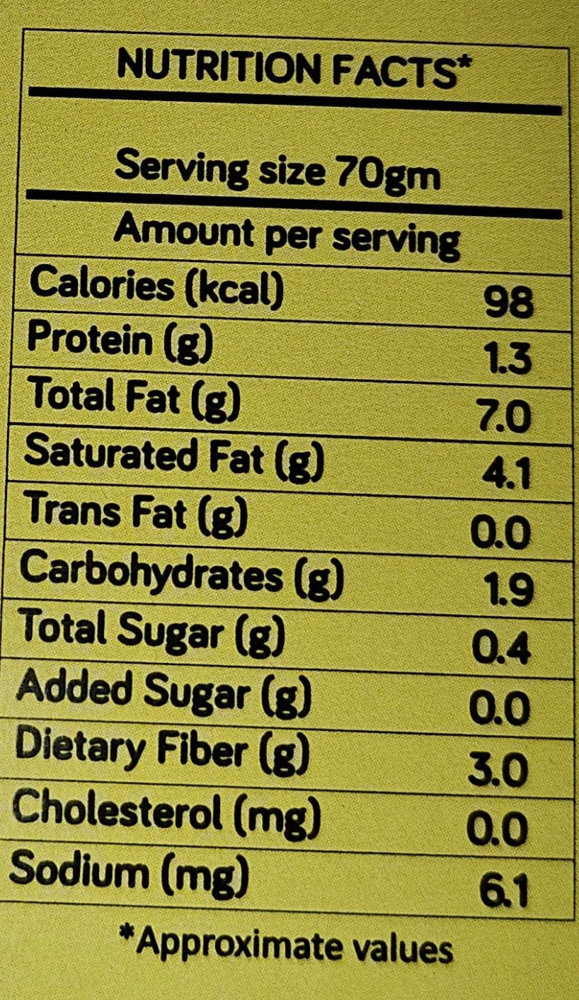 98 calories, 0% added sugar, 90% fat free. No added flavours, colours or preservatives.